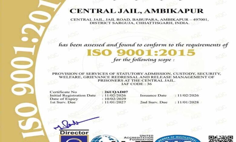 छत्तीसगढ़ की जेल व्यवस्थाओं में गुणवत्ता, पारदर्शिता और जवाबदेही को सुदृढ़ करने की दिशा में एक महत्वपूर्ण उपलब्धि हासिल हुई है। उप मुख्यमंत्री एवं जेल विभाग के प्रभारी मंत्री विजय शर्मा के निर्देशन में राज्य की जेलों की व्यवस्थाओं को बेहतर बनाने के लिए लगातार प्रयास किए जा रहे है। इन्हीं प्रयासों का ही यह परिणाम है कि छत्तीसगढ़ की सेंट्रल जेल रायपुर, दुर्ग, बिलासपुर एवं अम्बिकापुर को अंतरराष्ट्रीय गुणवत्ता मानक आईएसओ 9001ः2015 का प्रमाणन प्राप्त हुआ है।