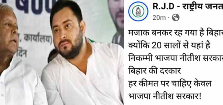 रविवार सुबह करीब 11:00 राष्ट्रीय जनता दल के फेसबुक पेज पर एक कविता का वीडियो शेयर किया गया। कविता के वीडियो के कवर पेज पर तेजस्वी सरकार की बात थी, लेकिन ऊपर कंटेंट में लिखा था- 'मजाक बनकर रह गया है बिहार! निकम्मी बीजेपी नीतीश सरकार! बिहार की दरगाह हर कीमत पर चाहिए केवल भाजपा नीतीश सरकार!' समाचार लिखे जाने तक इसे बदला नहीं गया और इसका स्क्रीनशॉट भाजपा वाले भी अब वायरल कर रहे हैं।