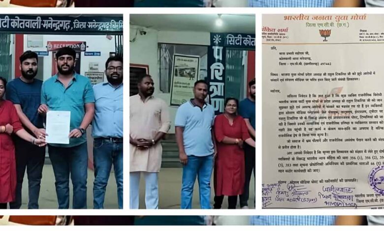 भारतीय जनता युवा मोर्चा (भाजयुमो) ने प्रदेश अध्यक्ष राहुल योगराज टिकरिहा के खिलाफ सोशल मीडिया पर फैलाई जा रही झूठी, भ्रामक और सुनियोजित अफवाहों के खिलाफ मोर्चा खोल दिया है। भाजयुमो पदाधिकारियों और कार्यकर्ताओं ने सिटी कोतवाली मनेंद्रगढ़ में पहुंचकर थाना प्रभारी सुनील तिवारी को एफआईआर हेतु आवेदन सौंपते हुए अफवाह फैलाने वालों पर कड़ी कार्रवाई की मांग की।