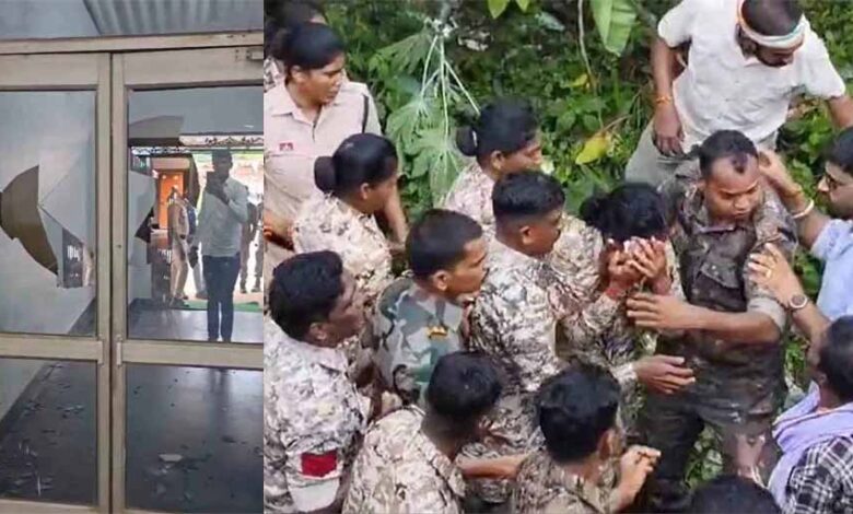 बीते शनिवार देर शाम जगदलपुर सर्किट हाउस में हुए बवाल का मामला अब सियासी तूल पकड़ चुका है. वन मंत्री केदार कश्यप पर कर्मचारियों से गाली-गलौज और मारपीट के आरोप लगे थे, जिसके बाद मामला थाने तक पहुंचा. इस घटना के विरोध में आज कांग्रेसियों ने भानपुरी स्थित वन मंत्री केदार कश्यप के निजी कार्यालय का घेराव किया. प्रदर्शन के दौरान एक महिला पुलिसकर्मी घायल हो गई. वहीं भाजपा ने कांग्रेसियों पर मंत्री कार्यालय में तोड़फोड़ करने का आरोप लगाया है.