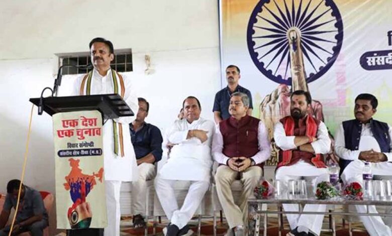 उप मुख्यमंत्री राजेन्द्र शुक्ल ने रीवा में “एक देश एक चुनाव” संगोष्ठी में कहा कि एक देश एक चुनाव वर्तमान समय की सबसे बड़ी मांग और चुनौती है। देश में 1952 से 1967 तक लोकसभा और विधानसभा के चुनाव साथ-साथ हुए हैं। अलग-अलगर कारणों से सरकारें भंग हुई और मध्यावधि चुनाव की नौबत आई। प्रधानमंत्री नरेन्द्र मोदी ने पुन: एक देश एक चुनाव का कठिन संकल्प लिया है। जिस तरह प्रधानमंत्री मोदी के अन्य संकल्प पूरे हुए उसी तरह यह संकल्प भी पूरा होगा। लोकसभा और विधानसभा के चुनाव एक साथ होने पर हजारों करोड़ रुपए की बचत होगी। विकास कार्यों के लिए अधिक राशि और अधिक समय मिलेगा। इस अभियान को सफल बनाने के लिए हर व्यक्ति और हर मतदाता को जागरूक करके इसमें शामिल करना होगा। संगोष्ठी का आयोजन जेएनसीटी इंजीनियरिंग कालेज रीवा में किया गया।