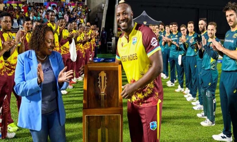 अपना आखिरी अंतरराष्ट्रीय मैच खेल रहे आंद्रे रसेल ने 15 गेंद में दो चौके और चार छक्कों की मदद से 36 रन की पारी खेली। होल्डर एक रन बनाकर आउट हुए। आखिर में गुडाकेश मोती ने नौ गेंद में एक चौका और दो छक्कों की मदद से नाबाद 18 रन बनाए। ऑस्ट्रेलिया की ओर से एडम जैम्पा ने तीन विकेट लिए। नाथन एलिस और मैक्सवेल को दो-दो विकेट मिले। वहीं, बेन ड्वारशुइस को एक बल्लेबाज को आउट किया।