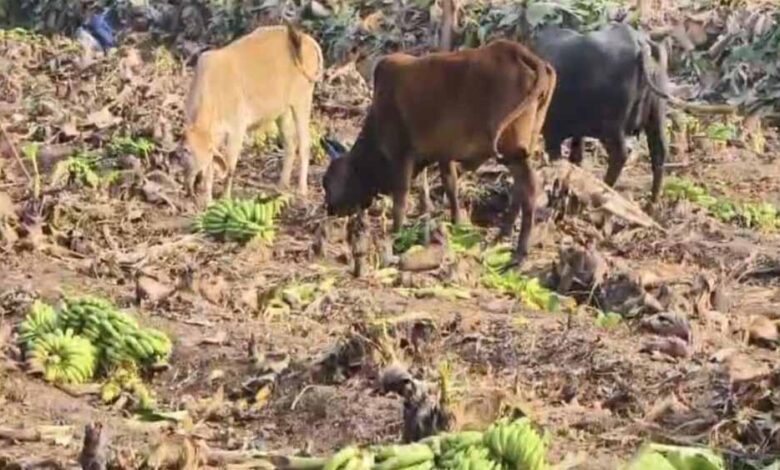 क्षेत्र में केला उत्पादक किसानों को इन दिनों फसल के दाम नहीं मिलने से आर्थिक नुकसान का सामना करना पड़ रहा है। केले के कम दाम मिलने से गुस्साए किसान फसल को काटकर मवेशियों को केले खिला रहे हैं। किसानों का कहना है कि वे अपनी फसल को खेत से उखाड़कर फेंकने को मजबूर हैं।