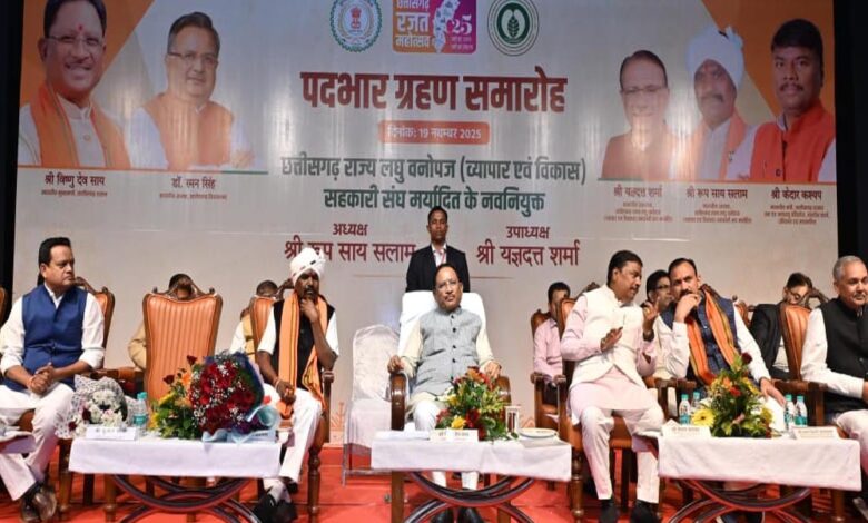 मुख्यमंत्री छत्तीसगढ़ राज्य लघु वनोपज (व्यापार एवं विकास) सहकारी संघ मर्यादित के नवनियुक्त अध्यक्ष और उपाध्यक्ष के पदभार ग्रहण कार्यक्रम में हुए शामिल