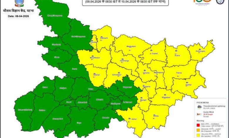 मौस विभाग के मुताबिक, शिवहर, सीतामढ़ी, मधुबनी, सुपौल, अररिया, किशनगंज, मुजफ्फरपुर, दरभंगा, सहरसा, मधेपुरा, पूर्णिया, कटिहार, वैशाली, समस्तीपुर, खगड़िया, भागलपुर, मुंगेर, बांका और जमुई जिले में येलो अलर्ट है. इन जिलों में तेज बारिश, ठनका गिरने के साथ-साथ 30 से 40 किलोमीटर प्रति घंटे की रफ्तार से हवा चलने की भी संभावना जताई है.