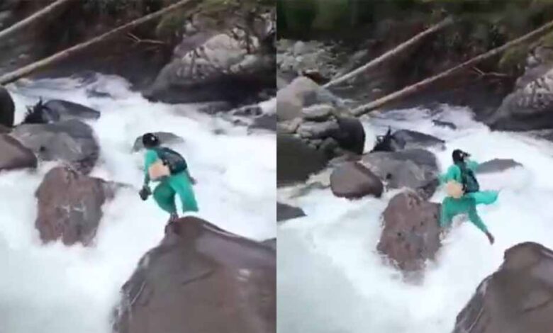 हिमाचल प्रदेश में बरसात कहर बरपा रही है। नदी-नाले उफान पर हैं। कई इलाकों में पुल और सड़कें बह चुकी हैं और आम जनजीवन अस्त-व्यस्त है। इसी बीच मंडी जिला की चौहारघाटी से एक वीडियो सोशल मीडिया पर तेजी से वायरल हो रहा है, जिसने सबको हैरान कर दिया। वीडियो में स्टाफ नर्स कमला उफनते नाले को पत्थरों पर छलांग लगाकर पार करती नजर आ रही हैं।