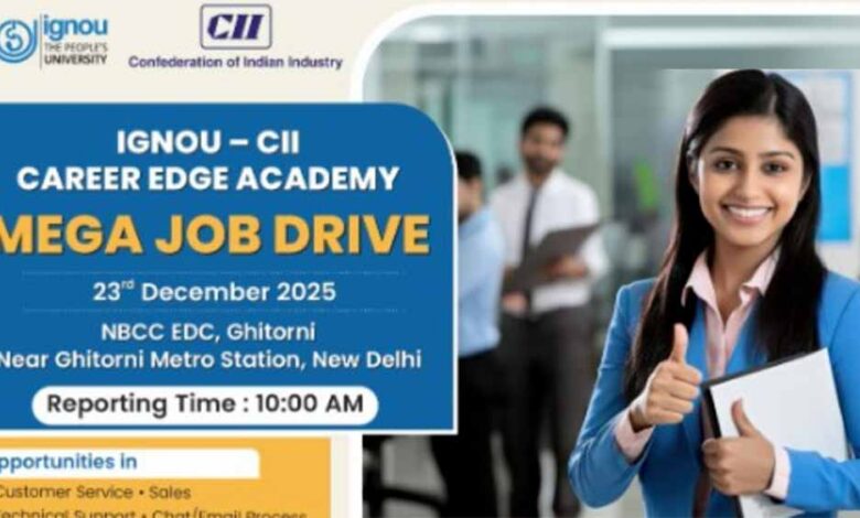 इंदिरा गांधी राष्ट्रीय मुक्त विश्वविद्यालय (IGNOU) 23 दिसंबर 2025 को एक बड़े रोजगार मेले का आयोजन करने जा रहा है। इग्नू इस मेले का आयोजन भारतीय उद्योग परिसंघ (CII) के साथ मिलकर करेगा। इस मेगा जॉब ड्राइव में इग्नू के वर्तमान छात्रों और पूर्व छात्रों को मौका मिलेगा। यह रोजगार मेला एनबीसीसी ईडीसी, घिटोर्नी, घिटोर्नी मेट्रो स्टेशन के पास, नई दिल्ली में आयोजित होगा। उम्मीदवारों को सुबह 10:00 बजे रिपोर्ट करना होगा।