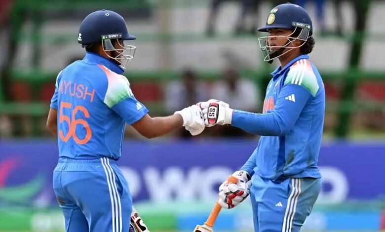 130 रनों के जवाब में उतरी टीम इंडिया की शुरुआत अच्छी नहीं रही. वैभव सूर्यवंशी और एरॉन जॉर्ज ने पारी का आगाज किया लेकिन दूसरे ही ओवर में एरॉन अपना विकेट गंवा बैठे. लेकिन इसके बाद आयुष ने वैभव के साथ मिलकर पारी को संभाला. दोनों के बीच अर्धशतकीय साझेदारी हुई. दूसरा झटका भारत को 87 के स्कोर पर लगा जब वैभव आउट हुए. वैभव ने 23 गेंद में 40 रन बनाए. अपनी पारी में सूर्यवंशी ने 3 छक्के और 2 चौके लगाए. वहीं, आयुष ने फिफ्टी जड़ी. 27 गेंदों में 53 रन बनाकर वो आउट हुए. आयुष ने 6 छक्के लगाए. 101 के स्कोर पर उनका विकेट गिरा. इसके बाद विहान मल्होत्रा और वेदांत ने पारी को संभाला. दोनों ने भारत को जीत दिलाई.