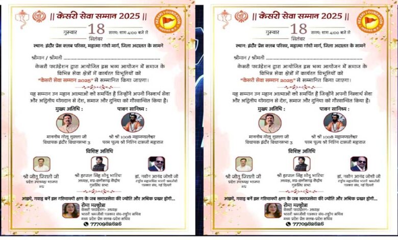 समाज सेवा और राष्ट्र सेवा के विभिन्न क्षेत्रों में उल्लेखनीय योगदान देने वाली 21 प्रतिभाशाली हस्तियों को “केसरी सेवा सम्मान 2025” से अलंकृत किया जाएगा। यह भव्य समारोह 18 सितंबर 2025, शाम 4 बजे इंदौर प्रेस क्लब परिसर में आयोजित होगा।