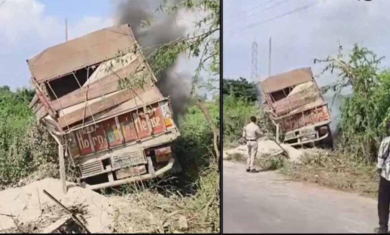टक्कर के बाद पलटा ट्रक, बाइक सवार दबकर जिंदा जले