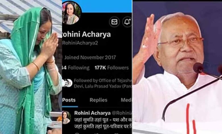 लालू प्रसाद यादव को अपनी किडनी दान कर उन्हें जीवनदान देने वाली बेटी रोहिणी आचार्य अब औपचारिक तौर पर राजनीति में कूद गई हैं। वह राजनीति में नहीं थीं, तब भी लालू के विरोधियों पर हमले के लिए जानी जाती थीं। जनवरी तक बिहार में चल रही महागठबंधन सरकार के गिरने की आशंका भी रोहिणी के सोशल मीडिया पोस्ट से ही सही हुई थी, जब उन्होंने सीधे सीएम नीतीश कुमार पर हमला बोला था। इस बार चुनाव में उतरीं रोहिणी ने कुछ देर पहले सोशल मीडिया पर लिखा है- "जहां सुमति तहां पूत – यश और कर्म गुणवाना। जहां कुमति तहां पूत-परिवार पर विपत्ति निधाना।।" रोहिणी ने चूंकि रामचरितमानस के सुंदर कांड के दोहे को बदल डाला है, इसलिए इसका सीधा अर्थ किसी किताब में नहीं मिल सकता है। जहां तक भाव का सवाल है तो कर्मकांड के जानकार पंडित शशिकांत मिश्र इसका अर्थ समझाते हैं कहते हैं कि शायद उनका आशय यह होगा- "सद्बुद्धि के कारण पूत (पुत्र), यश (धन-वैभव-पहचान), कर्म (सुखी संपन्न परिवार) और गुण (प्रगति के पथ पर अग्रसर) लालू परिवार को मिला है। दूसरी ओर चूंकि कुमति के कारण पूत, परिवार पर विपत्ति है।" संभवत: नीतीश कुमार के बेटे और मृत पत्नी को लेकर यह बातें कही गई हैं, क्योंकि पिछली बार भी जब नीतीश एनडीए में थे तो लालू परिवार से ऐसी बात सामने आयी थी।