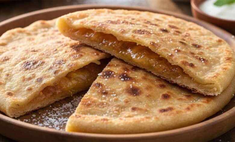 अब रोटी को पराठे की तरह तिकोना या गोल फोल्ड कर लें। किनारों को अच्छे से दबा दें ताकि चीनी बाहर न निकले। अब इसे हल्के हाथों से दोबारा पराठे की तरह बेल लें। ध्यान रहे कि बहुत ज्यादा दबाव न डालें, वरना पराठा फट सकता है।