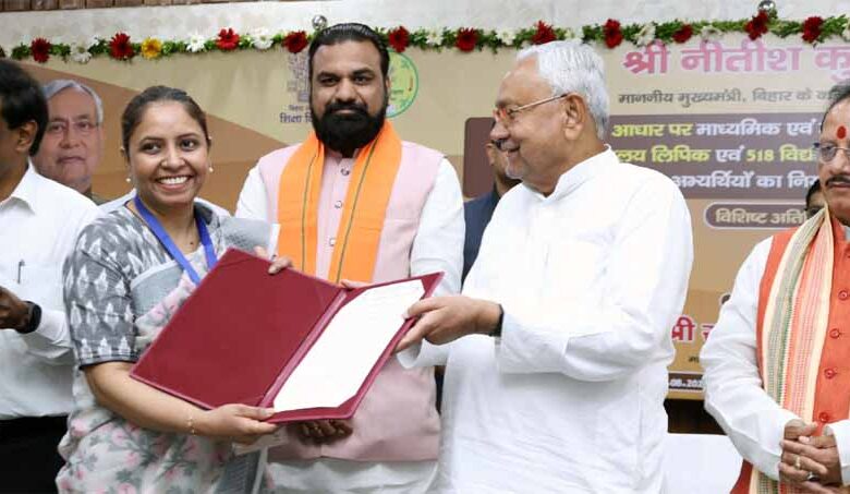 मुख्यमंत्री नीतीश कुमार ने आज मुख्यमंत्री सचिवालय स्थित 'संवाद' में अनुकंपा के आधार पर माध्यमिक एवं उच्च माध्यमिक विद्यालयों में 4835 विद्यालय लिपिक एवं 518 विद्यालय परिचारी के पदों पर चयनित कुल 5353 अभ्यर्थियों को नियुक्ति पत्र प्रदान किया। इस दौरान मुख्यमंत्री ने सांकेतिक रूप से मणि कुमारी,अमित गौरव, दिव्या राज, किरण कुमारी गुप्ता एवं तूबा अशरफ को नियुक्ति पत्र प्रदान किया। इस दौरान मुख्यमंत्री ने कहा कि सभी नवनियुक्त कर्मियों को मेरी हार्दिक बधाई एवं शुभकामनाएं है। मुझे विश्वास है कि सभी नवनियुक्त कर्मी पूरी ईमानदारी और निष्ठा के साथ अपने कर्तव्यों का निर्वहन करेंगे।