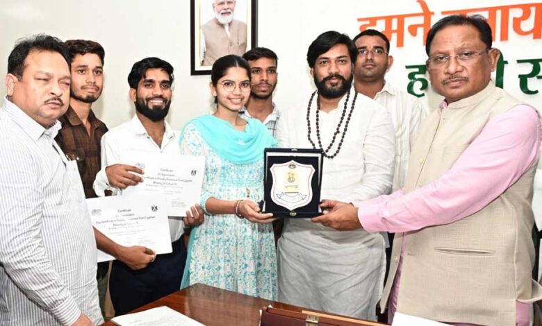 मुख्यमंत्री श्री विष्णुदेव साय से उनके निवास कार्यालय में पंथी नृत्य दल ने सौजन्य मुलाकात की। पंथी नृत्य दल के सदस्यों ने बताया कि वे 13 से 24 फरवरी 2025 तक मिस्र (इजिप्ट) में आयोजित अंतर्राष्ट्रीय सांस्कृतिक महोत्सव में भारत का प्रतिनिधित्व कर चुके है। मुख्यमंत्री श्री साय ने पंथी नृत्य दल के सभी कलाकारों को अपने कला-प्रदर्शन के माध्यम से विदेश की धरती पर छत्तीसगढ़ की माटी की सुगंध बिखेरने के लिए बधाई और शुभकामनाएं दीं। इस अवसर पर विधायक श्री खुशवंत सिंह साहेब उपस्थित थे।