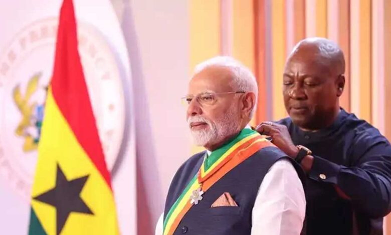 प्रधानमंत्री नरेंद्र मोदी को बुधवार को पश्चिम अफ्रीकी देश घाना के सर्वोच्च राष्ट्रीय सम्मान 'द ऑफिसर ऑफ द ऑर्डर ऑफ द स्टार ऑफ घाना' से सम्मानित किया गया। भारतीय प्रधानमंत्री को यह सम्मान उन्हें उनकी 'प्रतिष्ठित राजनीति और प्रभावशाली वैश्विक नेतृत्व' के लिए दिया गया। घाना के राष्ट्रपति जॉन ड्रामानी महामा ने पीएम मोदी को पुरस्कार प्रदान किया। प्रधानमंत्री मोदी पांच देशों की यात्रा के पहले चरण में घाना पहुंचे हैं। इस दौरान दोनों देशों के नेताओं के बीच बैठक हुई, जिसमें अहम समझौतों पर हस्ताक्षर किए गए।