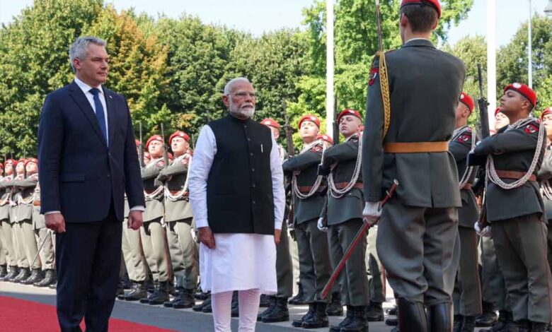 प्रधानमंत्री नरेन्द्र मोदी की मेजबानी ऑस्ट्रियाई चांसलर कार्ल नेहमर ने की। यह दोनों नेताओं के बीच पहली मुलाकात है। द्विपक्षीय साझेदारी के संबंध में चर्चा होगी।’’ एक तस्वीर में मोदी नेहमर को गले लगाते नजर आ रहे हैं, जबकि दूसरी तस्वीर में ऑस्ट्रियाई चांसलर प्रधानमंत्री के साथ सेल्फी लेते नजर आ रहे हैं। नेहमर ने भी मोदी के साथ की एक तस्वीर सोशल मीडिया पर साझा की और कहा, ‘‘प्रधानमंत्री नरेन्द्र मोदी, वियना में आपका स्वागत है! ऑस्ट्रिया में आपका स्वागत करना हमारे लिए खुशी और सम्मान की बात है। ऑस्ट्रिया और भारत मित्र और साझेदार हैं। आपकी यात्रा के दौरान राजनीतिक और आर्थिक चर्चाओं को लेकर उत्सुक हूं।’’