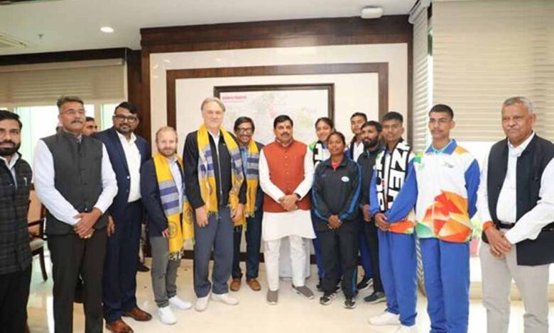 मुख्यमंत्री डॉ. मोहन यादव से शहडोल के ग्राम विचारपुर के फुटबॉल खिलाड़ियों ने मंगलवार को मंत्रालय में भेंट की। खिलाड़ियों के साथ उनके जर्मन प्रशिक्षक डाइटमर बायर्सडार्फर, मैनुअल शेफ़र और खेल संचालक श्री राकेश गुप्ता भी उपस्थित रहे। मुख्यमंत्री डॉ. यादव ने समस्त खिलाड़ियों को उत्कृष्ट प्रदर्शन के लिए बधाई और भावी स्पर्धाओं में सफलता के लिए शुभकामनाएं दीं। मुख्यमंत्री डॉ. यादव ने दोनों अंतर्राष्ट्रीय प्रशिक्षकों का स्वागत किया।