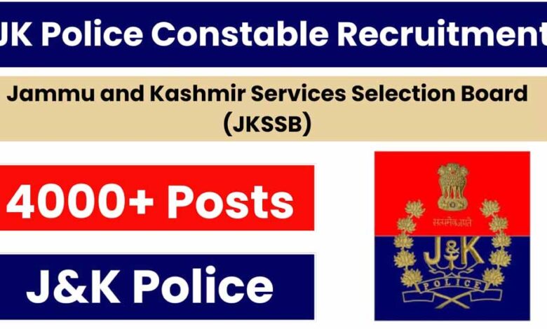 जम्मू और कश्मीर सर्विस सेलेक्शन बोर्ड (JKSSB) 4,002 कांस्टेबल पदों पर भर्ती करने जा रहा है। आवेदन प्रकिया 30 जुलाई से शुरू हो रही है। एप्लीकेशन लिंक एक्टिव होने के बाद योग्य व इच्छुक कैडिडेट ऑफिशियल वेबसाइट jkssb.nic.in के माध्यम से आवेदन कर सकते हैं। आवेदन करने की लास्ट डेट 29 अगस्त है। इस भर्ती के तहत कांस्टेबल आर्म्ड/आईआरपी, कांस्टेबल एसडीआरएफ, कांस्टेबल टेलिकम्युनिकेशन, कांस्टेबल फोटोग्राफर, कांस्टेबल एग्जीक्यूटिव पुलिस जैसे पदों पर बहाली की जायेगी।