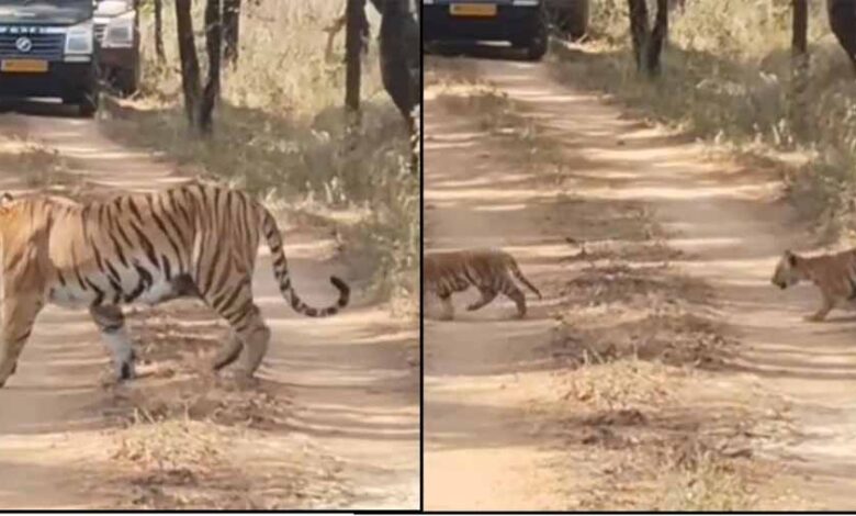पांच शावकों के साथ कच्ची सड़क पर आई बाघिन