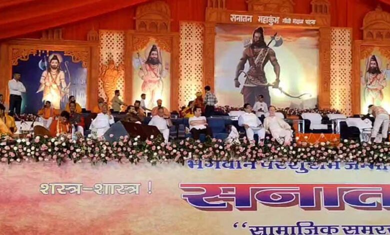 भगवान परशुराम जन्म महोत्सव के समापन अवसर पर आज पटना के गांधी मैदान में पहली बार सनातन महाकुंभ की शुभारंभ हो चुका है। हनुमान चालीसा और परशुराम चालीसा के पाठ से कार्यक्रम की शुरुआत हो चुकी है। राज्यपाल आरिफ मोहम्मद खान और डिप्टी सीएम विजय सिन्हा भी कार्यक्रम में शामिल हुए हैं। बाबा बागेश्वर धाम के पंडित धीरेंद्र शास्त्री भी पहुंच चुके हैं। उन्होंने प्रभु श्रीराम के जयकारे लगाए। अपने संबोधन के दौरान उन्होंने कहा कि भारत हिंदू राष्ट्र होगा तो पहला हिंदू राज्य बिहार होगा, बहुत सारी ताकतें गजवा ए हिंद बनाना चाहती हैं। हमारे धर्म पर घात हुआ तो हमलोग प्रतिघात करेंगे। हमारा सपना भगवा ए हिंद है। हमें मुस्लमानों और ईसाईयों से दिक्कत नहीं। बिहार चुनाव के बाद राज्य में पद यात्रा करूंगा।