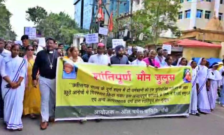 झारखंड के रांची में ऑल चर्चेस कमेटी रांची के द्वारा छत्तीसगढ़ में दो धर्म बहनों के साथ घटित घटना के विरोध में शांतिपूर्ण मौन जुलूस निकाला गया। इस जुलूस में राज्य की कृषि, पशुपालन एवं सहकारिता मंत्री शिल्पी नेहा तिर्की भी शामिल हुई।