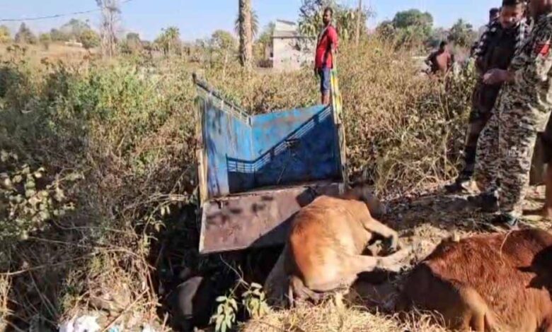 गौवंश तस्करी करते तस्कर फरार, पुलिस की घेराबंदी में पलटा वाहन, तीन गायों की जान गई