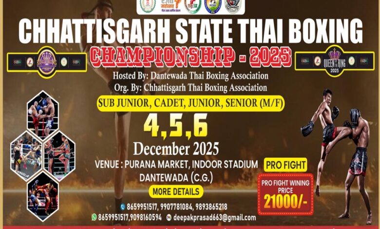 जिला प्रशासन एवं खेल एवं युवा कल्याण विभाग के तत्वावधान में राज्य स्तरीय थाई बॉक्सिंग चैंपियनशिप–2025 का आयोजन पुराना मार्केट स्थित इंदिरा स्टेडियम, दंतेवाड़ा में जारी है। दो दिवसीय यह प्रतियोगिता सब जूनियर, कैडेट, जूनियर एवं सीनियर प्रो फाइट (बालक/बालिका) वर्ग में हो रही है, जिसमें प्रदेश के विभिन्न जिलों से आए खिलाड़ी भाग ले रहे हैं।