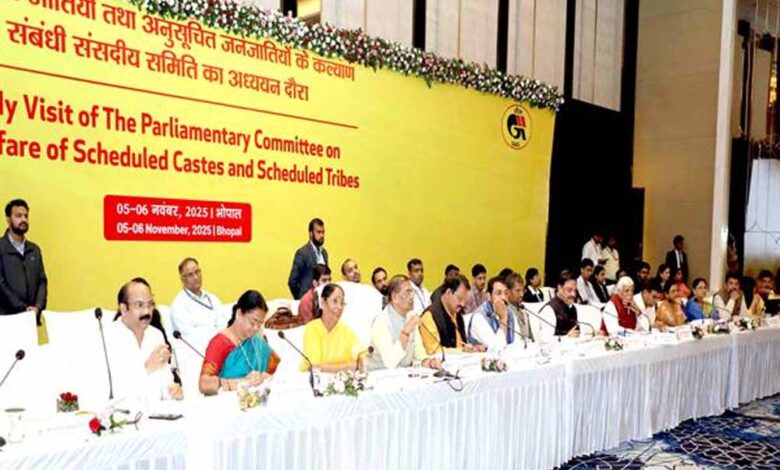 अनुसूचित जाति एवं जनजाति कल्याण संबंधी योजनाओं के लिए मध्यप्रदेश के अध्ययन दौरे पर आई संसदीय समिति ने गुरूवार को भोपाल में इन वर्गों के कल्याण की योजनाओं एवं उनकी वर्तमान सामाजिक आर्थिक स्थिति की समीक्षा की। बैठक की अध्यक्षता सांसद श्री फग्गन सिंह कुलस्ते ने की। संसदीय समिति ने जनजातीय क्षेत्र में साक्षरता दर बढ़ाने, जनजातीय एवं अनुसूचित वर्गों के विद्यार्थियों को कौशल संपन्न बनाने और मैदानी स्तर पर उनकी कल्याणकारी योजनाओं के प्रभावी क्रियान्वयन करने की अपेक्षा की।