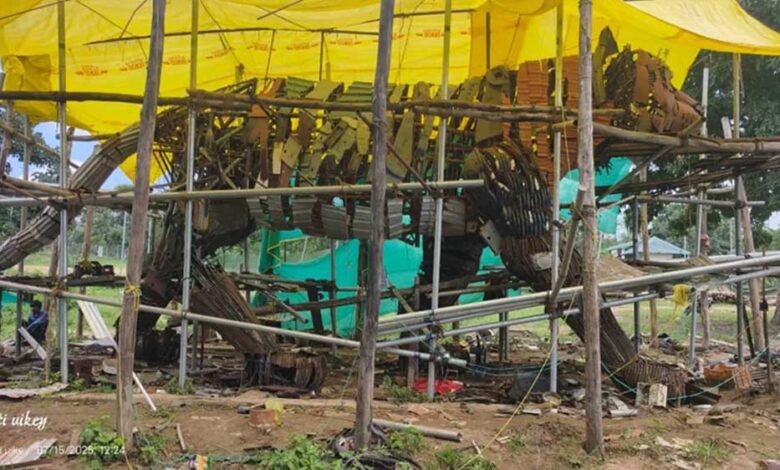 जनवरी माह में लोहे के अनुपयोगी सामग्रियों जैसे पुरानी साईकिल, पाइप, जंग लगी लोहे की चादरें आदि विविधतापूर्ण सामग्रियों से प्रतिमा का निर्माण प्रारंभ किया गया था, जो अब वह लगभग अपनी पूर्णता पर है।