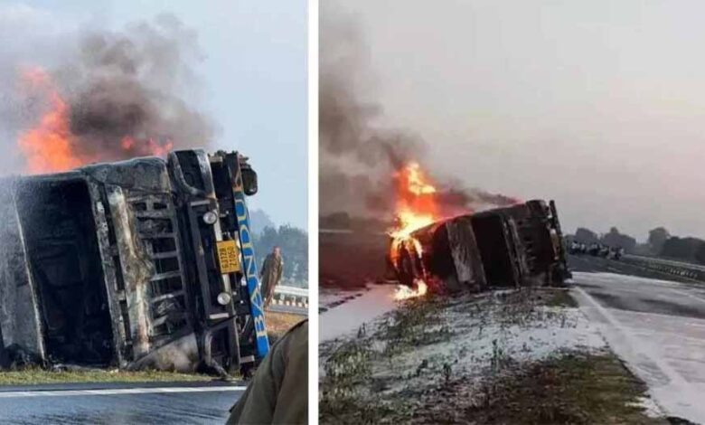 जिले के जयपुर बरेली हाईवे पर बुधवार सुबह एक केमिकल से भरा टैंकर मनोहरपुर गांव के पास बेकाबू होकर पलट गया। पलटने के बाद केमिकल से भरे टैंक फट गए। जिससे भीषण आग लग गई। धमाके की आवाज और आग की लपटे देखकर आसपास के लोग मौके पर पहुंचे। टैंकर राया की ओर से नेशनल हाईवे की तरफ जा रहा था। लोगों ने दमकल विभाग को सूचना दी। इसके बाद दमकल की पांच गाड़ियां और रिफाइनरी की टीम में मौके पर पहुंची। आग पर काबू पाने की कोशिश में जुटे एफएसओ किशन सिंह और फायरमैन शकीरा झुलस गए।