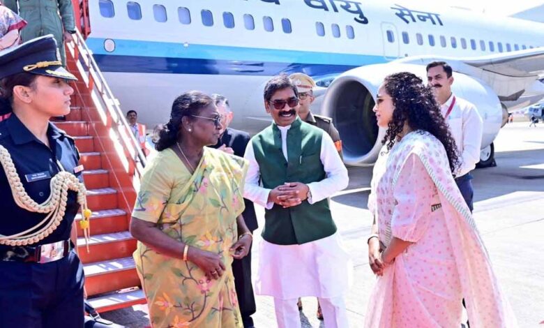राष्ट्रपति द्रौपदी मुर्मु शुक्रवार को अपने निर्धारित दौरे पर झारखंड की राजधानी रांची पहुंचीं। उनका स्वागत बिरसा मुंडा एयरपोर्ट पर भव्य तरीके से किया गया। राज्यपाल संतोष गंगवार और मुख्यमंत्री हेमंत सोरेन भी एयरपोर्ट पर मौजूद रहे।