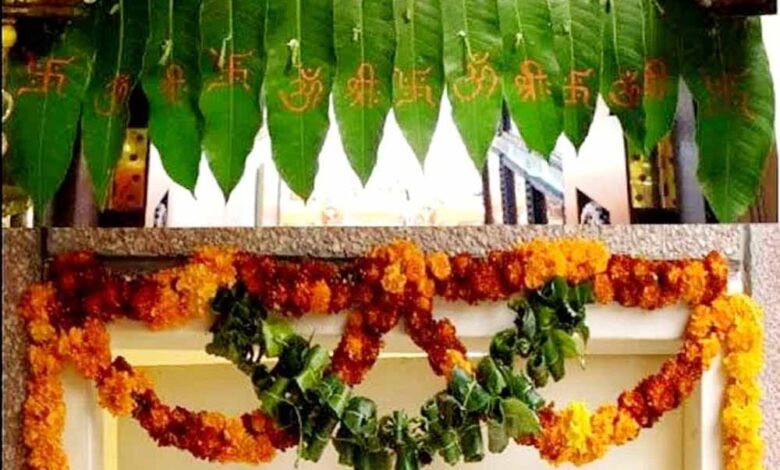 तोरण बनाने के लिए आम के पत्तों का इस्तेमाल करना शुभ माना गया है। इसके साथ ही आप अशोक की पत्तियों का भी इस्तेमाल कर सकते हैं। इसके साथ ही तोरण बनाने में गेंदे का फूलों का भी इस्तेमाल किया जाता है। वास्तु शास्त्र में माना गया है कि तोरण बनाने के लिए आपको 5, 7, 11 या फिर 21 पत्तों का इस्तेमाल करना चाहिए। इसके साथ ही आम के पत्तों पर पीले या लाल चंदन से “शुभ लाभ” जरूर लिखें। इससे सकारात्मक ऊर्जा का संचार बढ़ता है।