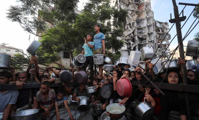 खाना न मिलने की बेबसी इन मासूमों के चेहरे पर साफ नजर आती है। हाथों में बर्तन थामे यह सब इंतजार कर रहे हैं कि कब खाना मिलेगा। गाजा में इजरायल के हमलों के बीच बड़ी संख्या में लोग विस्थापित हैं। इनके बीच खाने को मारा-मारी की नौबत आ जाती है।
