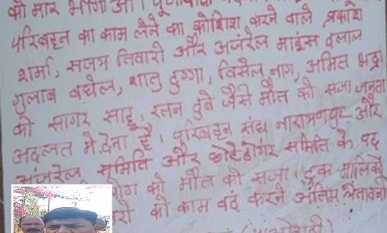 बस्तर के नारायणपुर जिले में नक्सलियों ने पर्चा फेंककर भाजपा के वरिष्ठ नेताओं को जान से मारने की धमकी दी है। प्राप्त जानकारी के अनुसार नारायणपुर में नक्सलियों ने पर्चा फेंककर भाजपा के आधा दर्जन से अधिक वरिष्ठ नेताओं को जान से मारने की धमकी दी है। मंत्री केदार कश्यप के करीबियों को मौत की सजा देने का नक्सलियों ने फरमान जारी किया है।