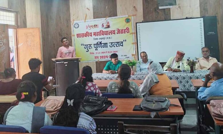 मध्य प्रदेश शासन उच्च शिक्षा विभाग के निर्देशानुसार शासकीय महाविद्यालय जैतहरी में गुरू पूर्णिमा पर कार्यक्रम आयोजित किया गया । कार्यक्रम का शुभारंभ अतिथियों के द्वारा मां सरस्वती के छायाचित्र पर माल्यार्पण एवं समक्ष में दीप प्रज्जवन कर किया गया। इस अवसर पर कार्यक्रम के मुख्य अतिथि पूर्व सहायक प्राध्यापक डॉ.परमानंद तिवारी ने विद्यार्थियों को संबोधित करते हुए गुरु पूर्णिमा के महत्व को समझाया। उन्होंने बताया कि गुरु का विद्यार्थियों के जीवन में बहुत महत्व है। विशिष्ट अतिथि शासकीय तुलसी महाविद्यालय अनूपपुर के प्राचार्य डॉ. जे .के. संत के द्वारा विद्यार्थियों को तुलसीदास एवं रहीम के दोहों को विद्यार्थियों के समक्ष प्रस्तुत किया गया एवं जैतहरी महाविद्यालय के प्राचार्य डॉ.आर.एस वाटे ने विद्यार्थियों को गुरु के महत्व को समझाया और विद्यार्थियों के उज्ज्वल भविष्य की कामना की। इस अवसर पर महाविद्यालय स्टॉप सहित महाविद्यालय में अध्ययनरत छात्र, छात्राएं व राष्ट्रीय सेवा योजना के स्वयंसेवक उपस्थित रहे।